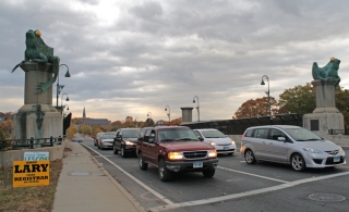 Jensen's sculpture of the frog perched on a spool of thread is public art installed in multiples at both ends of the bridge, forming the gateway into downtown Willimantic.